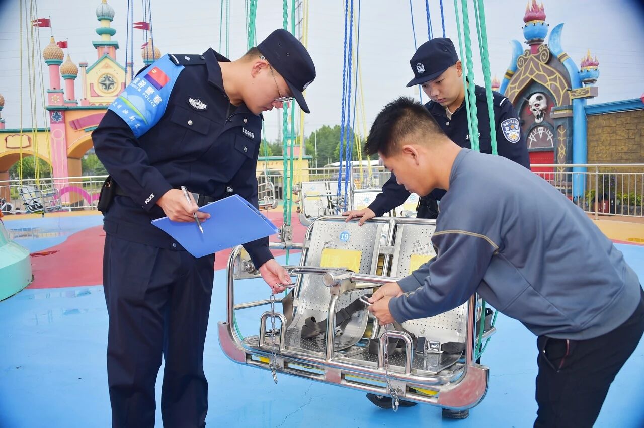 在现场检查环节,民警重点检查关注设备的主体结构、安全装置、制动系统等关键部位,特别是乘客安全束缚装置、吊挂乘坐的保险装置等安全保护装置,要求相关责任人落实好各项安全措施,确保“双节”期间游客安全。